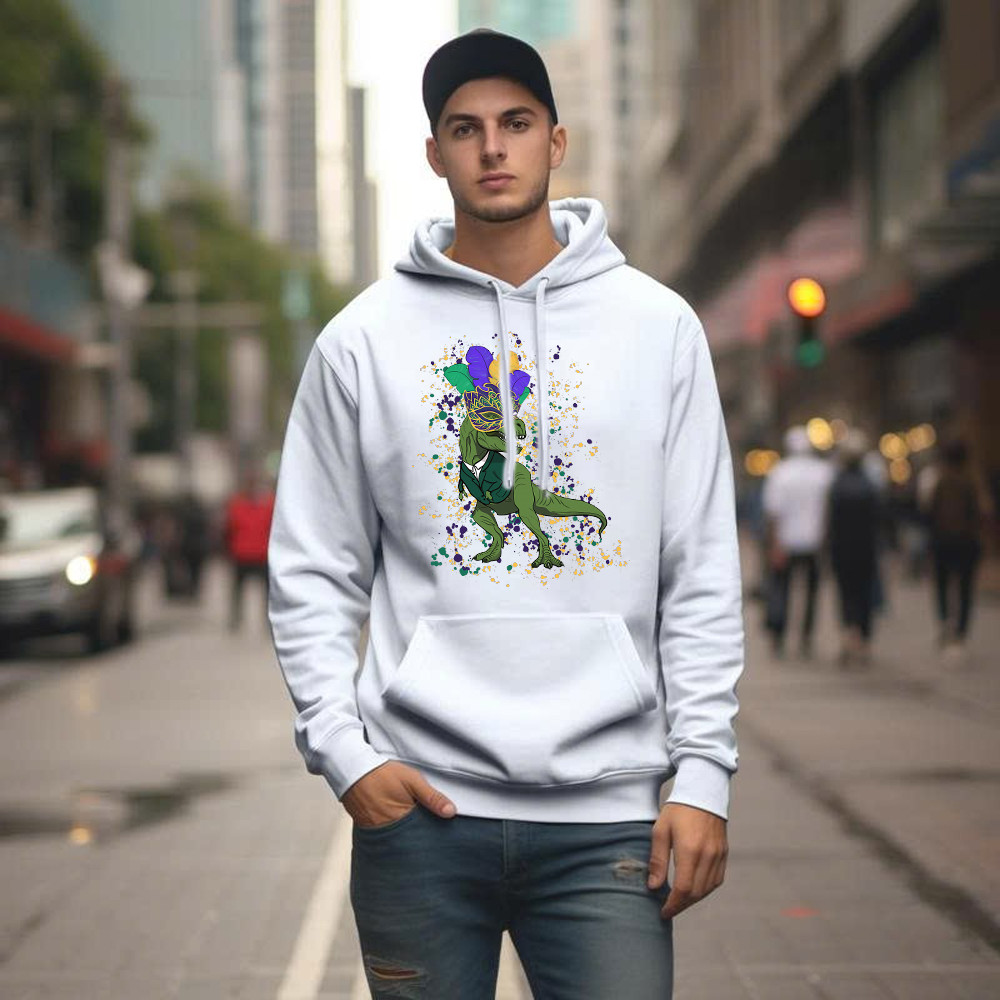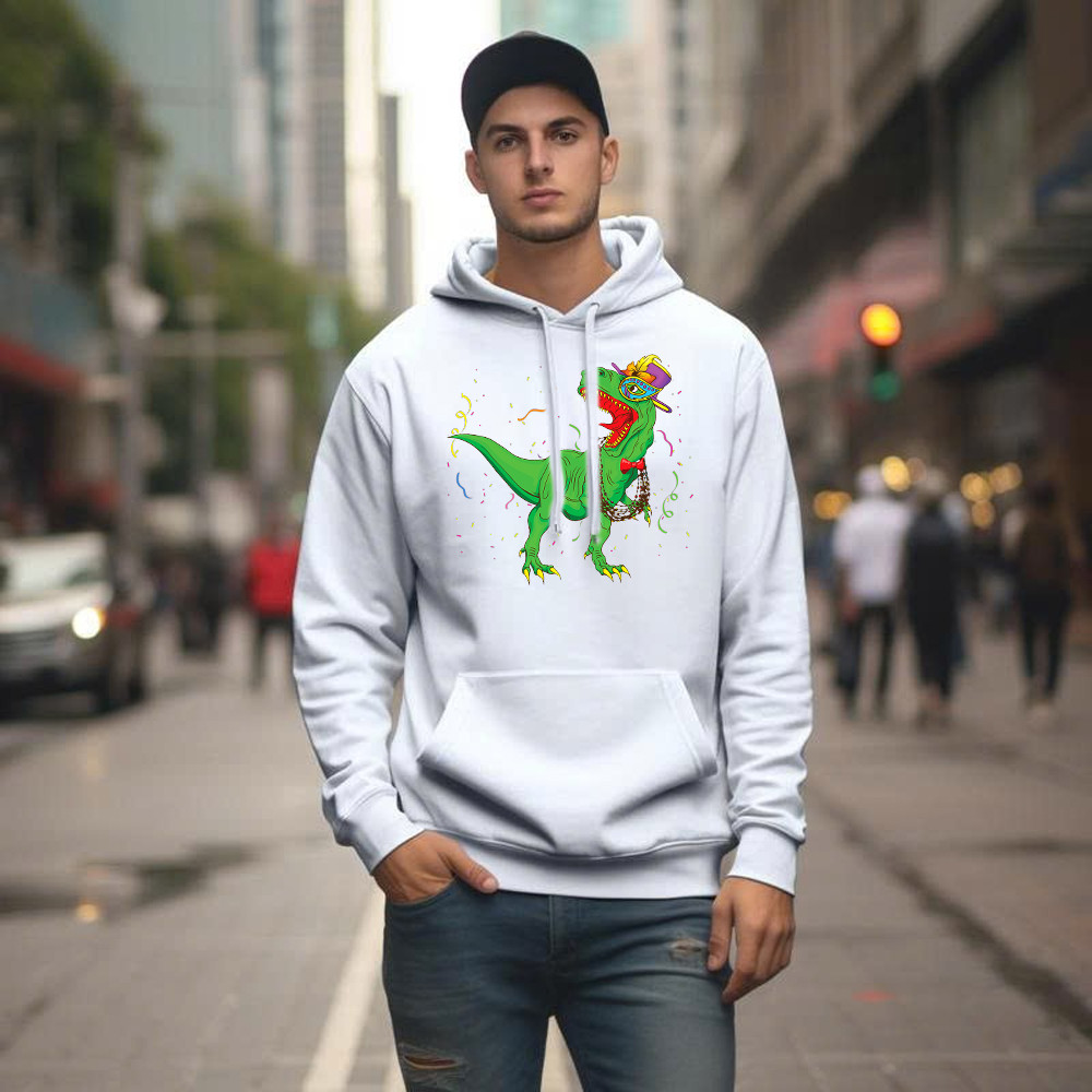 T-Rex Dinosaur Mardi Gras Hoodie Themed Mardi Gras Gift Ideas For Him. Unisex. Hoodie printed in USA. Exclusive products made by: Rivonaprint. 8 oz 50/50 cotton/poly. Air jet yarn creates a smooth, low-pill surface. Double needle stitching; Pouch pocket; Unisex sizing. Decoration type: Digital Print. All products are made to order and proudly printed to…