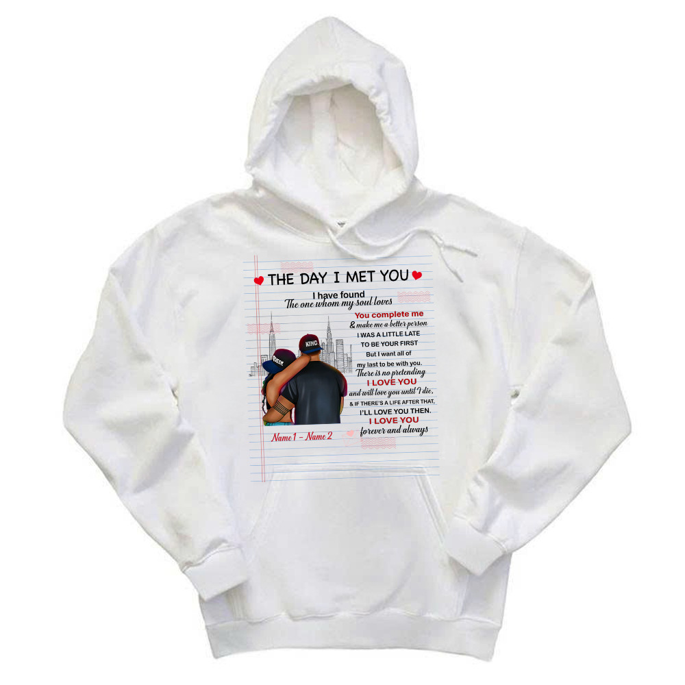 The Day I Met You I Have Found The One Whom My Soul Loves Hoodie Matching Shirts For Couples. Unisex. Hoodie printed in USA. Exclusive products made by: Rivonaprint. 8 oz 50/50 cotton/poly. Air jet yarn creates a smooth, low-pill surface. Double needle stitching; Pouch pocket; Unisex sizing. Decoration type: Digital Print. All products are…