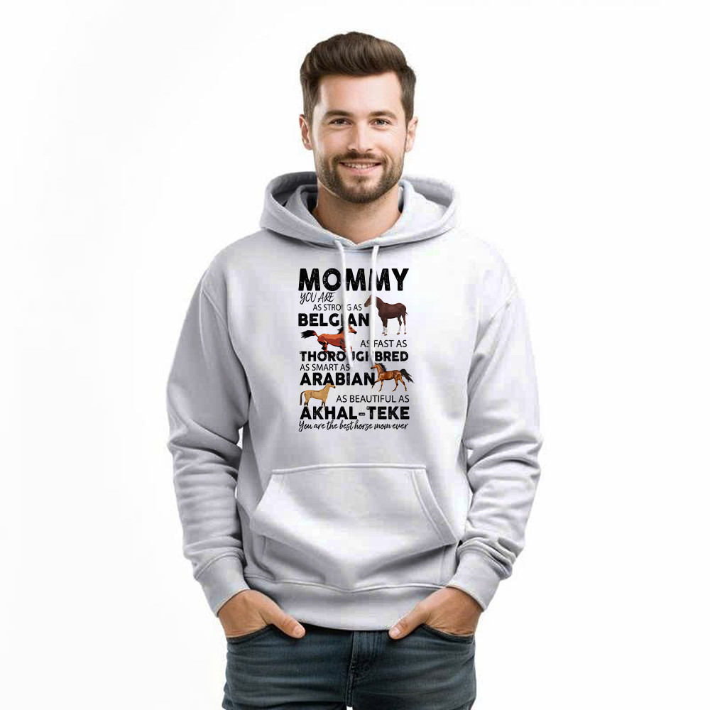 Mommy You Are As Strong As Belgian Thoroughbred Arabian Akhal Teke Hoodie Horse Lover Mom Gift. Unisex. Hoodie printed in USA. Exclusive products made by: Rivonaprint. 8 oz 50/50 cotton/poly. Air jet yarn creates a smooth, low-pill surface. Double needle stitching; Pouch pocket; Unisex sizing. Decoration type: Digital Print. All products are made to order…