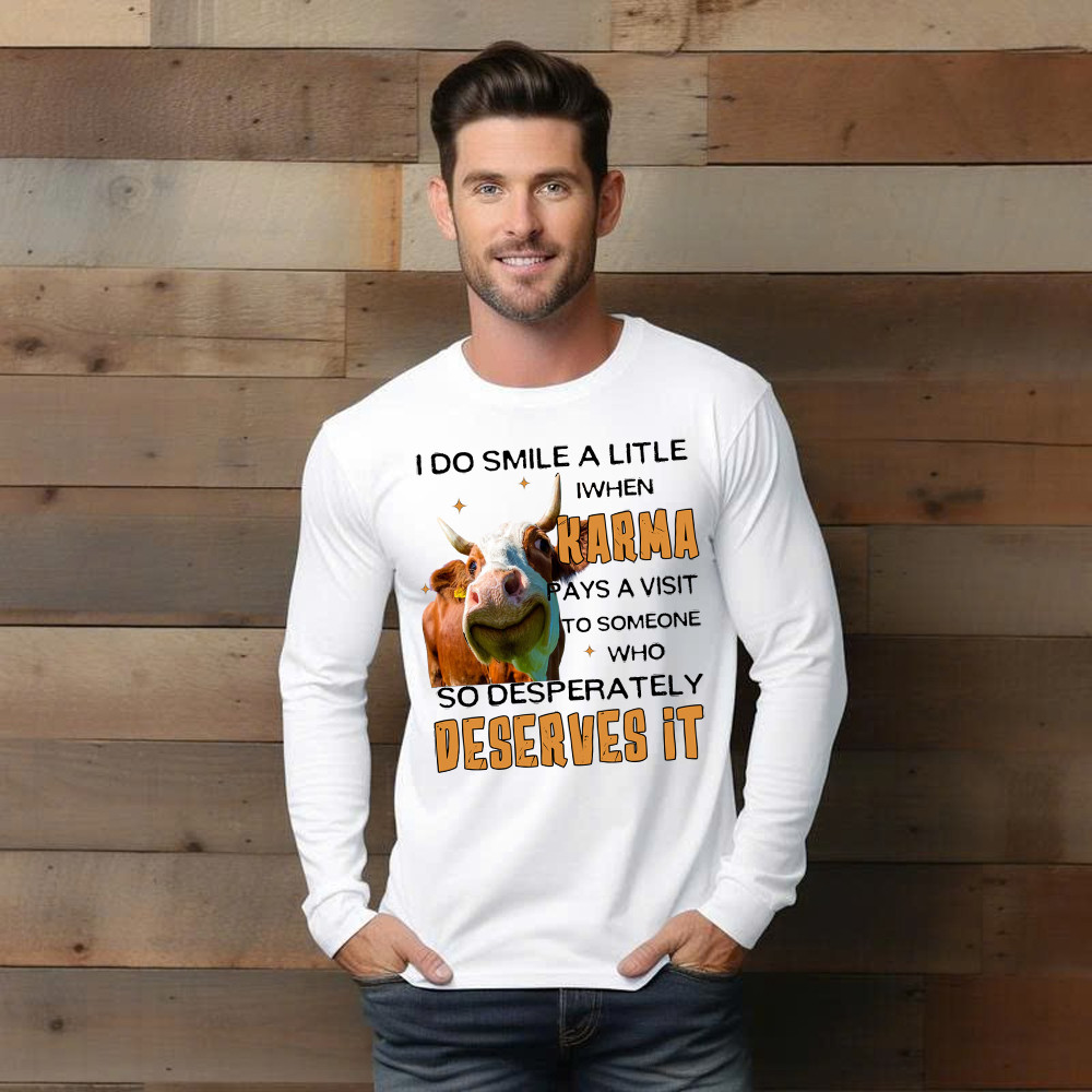 I Do Smile A Litlle When Karma Pays A Visit Shirt Funny Cow Graphic Long Sleeve Shirt Gift For Men. Long Slevee Shirt product print in the USA. Exclusive products made by: Rivonaprint. Material: 100% cotton. Soft, moisture-wicking, breathable, and comfortable fabric. Double-stitched sleeves and hem. Relatively relaxed fit, suitable for both males and females….