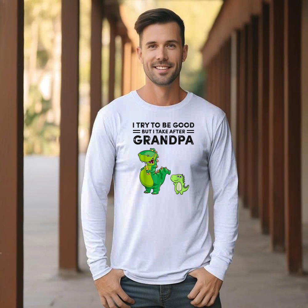 I Try To Be Good But I Take After Grandpa Shirt Funny Drinking Dinosaurs Long Sleeve Shirt Grandpa Gift. Long Slevee Shirt product print in the USA. Exclusive products made by: Rivonaprint. Material: 100% cotton. Soft, moisture-wicking, breathable, and comfortable fabric. Double-stitched sleeves and hem. Relatively relaxed fit, suitable for both males and females. Ribbed…