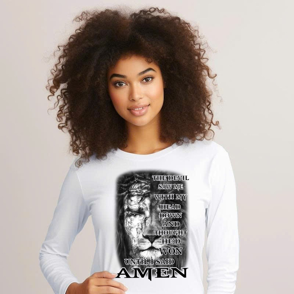 Jesus Lion Shirt Christian The Devil Saw Me With My Head Down Until I Said Amen Long Sleeve Shirt. Long Slevee Shirt product print in the USA. Exclusive products made by: Rivonaprint. Material: 100% cotton. Soft, moisture-wicking, breathable, and comfortable fabric. Double-stitched sleeves and hem. Relatively relaxed fit, suitable for both males and females. Ribbed…