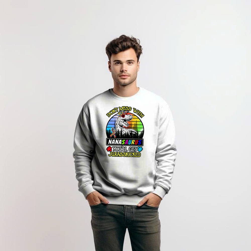 Don’t Mess With Nanasaurus Sweatshirt Dinosaur Graphic Autism Awareness Shirts Gifts For Grandma. Sweatshirt product print in the USA. Exclusive products made by: Rivonaprint. 1×1 athletic rib cuffs and waistband with spandex; Double-needle stitching. 8 oz; 50% cotton/50% polyester. Decoration type: Digital Print. All products are made to order and proudly printed to the best…