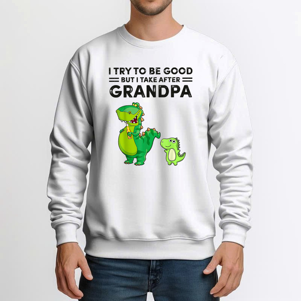 I Try To Be Good But I Take After Grandpa Shirt Funny Drinking Dinosaurs Sweatshirt Grandpa Gift. Sweatshirt product print in the USA. Exclusive products made by: Rivonaprint. 1×1 athletic rib cuffs and waistband with spandex; Double-needle stitching. 8 oz; 50% cotton/50% polyester. Decoration type: Digital Print. All products are made to order and proudly…