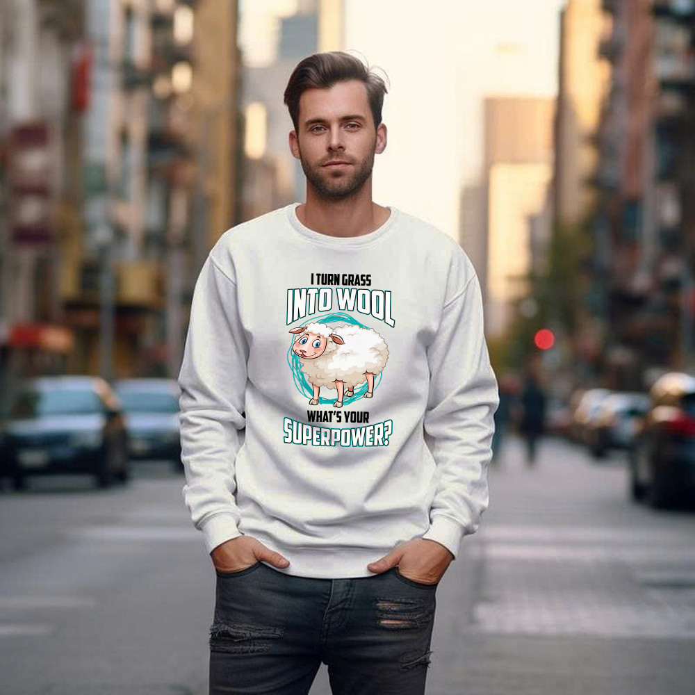 I Turn Grass Into Wool What s Your Superpower Shirt Sheep Farmer Cute Sweatshirt Gift For Dad. Sweatshirt product print in the USA. Exclusive products made by: Rivonaprint. 1×1 athletic rib cuffs and waistband with spandex; Double-needle stitching. 8 oz; 50% cotton/50% polyester. Decoration type: Digital Print. All products are made to order and proudly…