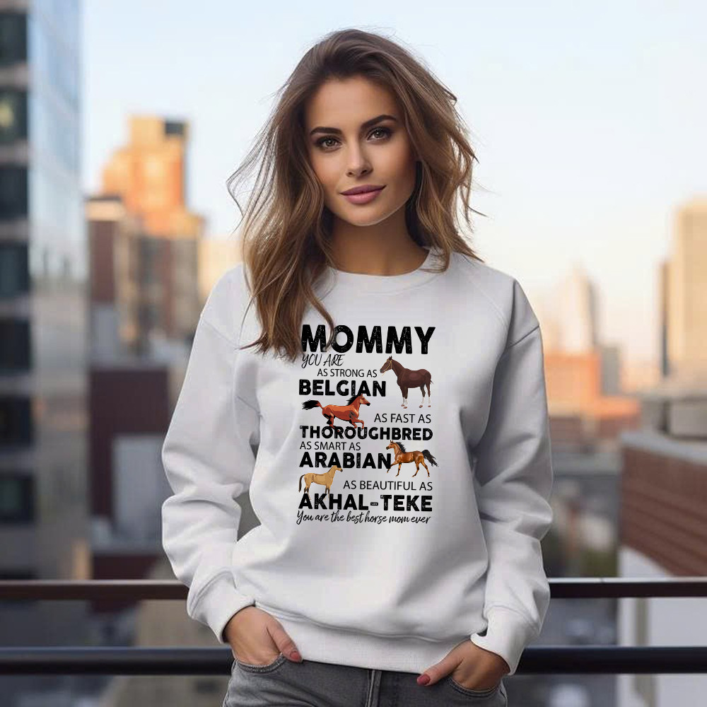Mommy You Are As Strong As Belgian Thoroughbred Arabian Akhal Teke Sweatshirt Horse Lover Mom Gift. Sweatshirt product print in the USA. Exclusive products made by: Rivonaprint. 1×1 athletic rib cuffs and waistband with spandex; Double-needle stitching. 8 oz; 50% cotton/50% polyester. Decoration type: Digital Print. All products are made to order and proudly printed…