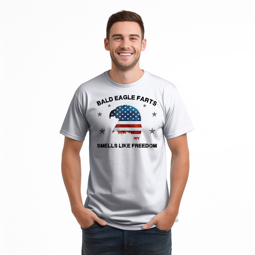 Bald Eagle Farts Smells Like Freedom T-Shirt Patriotic Themed Clothing Mens. T-Shirts printed in the USA Exclusive products made by: Rivonaprint. Material: 5.3-ounce, 100% cotton. Seamless double-needle 7/8. Taped neck and shoulders; Tearaway label. Decoration type: Digital Print. All products are made to order and proudly printed to the best standards available. They do not…
