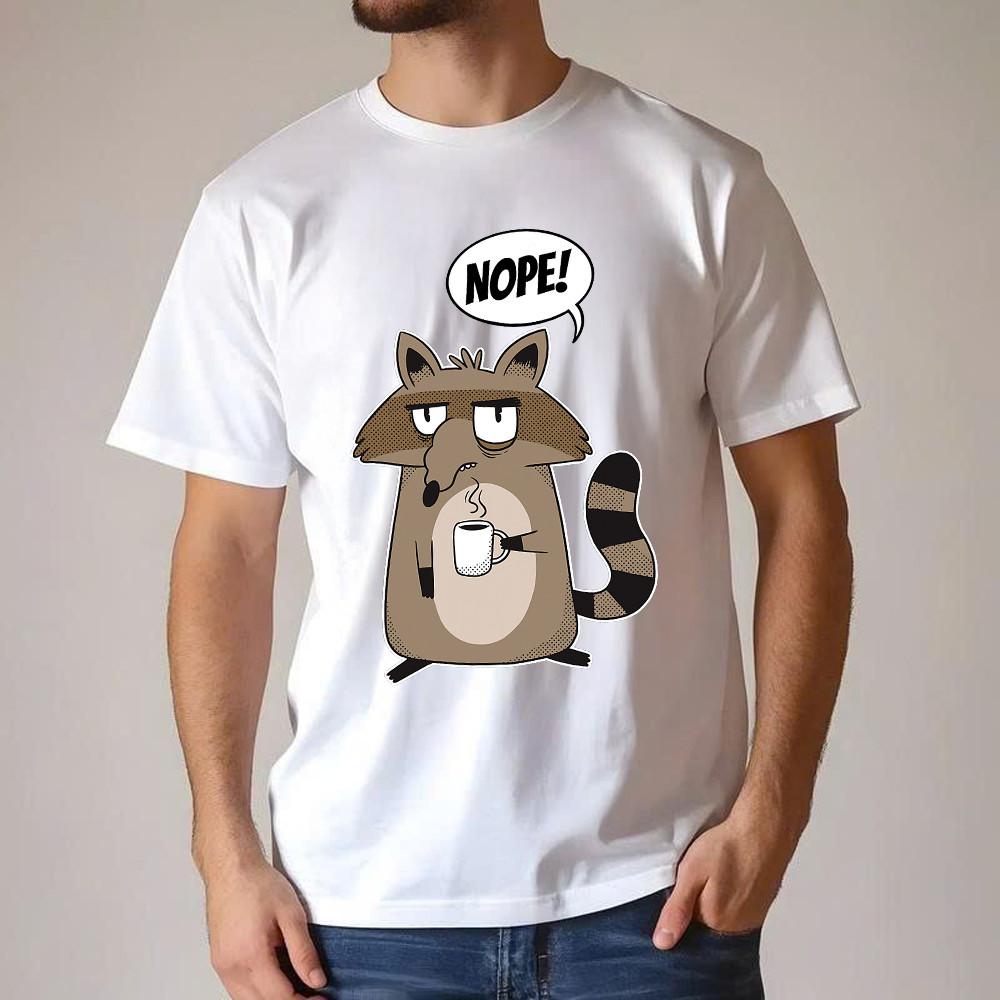 Racoon Morning Coffee Nope T Shirt Hilarious Funny Racoon Shirt Graphic Tee. T-Shirts printed in the USA Exclusive products made by: Rivonaprint. Material: 5.3-ounce, 100% cotton. Seamless double-needle 7/8. Taped neck and shoulders; Tearaway label. Decoration type: Digital Print. All products are made to order and proudly printed to the best standards available. They do…