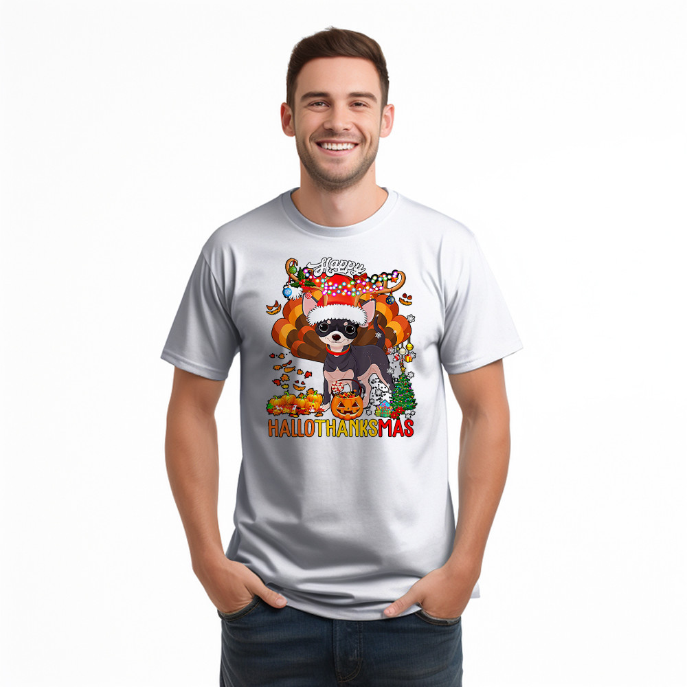 Reindeer Santa Turkey Chihuahua Shirt Hallothanksmas Happy T-Shirt Gift For Chihuahua Lovers. T-Shirts printed in the USA Exclusive products made by: Rivonaprint. Material: 5.3-ounce, 100% cotton. Seamless double-needle 7/8. Taped neck and shoulders; Tearaway label. Decoration type: Digital Print. All products are made to order and proudly printed to the best standards available. They do…