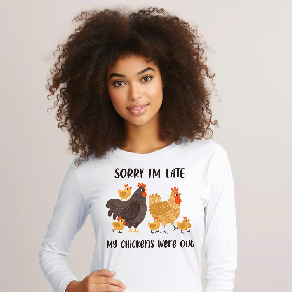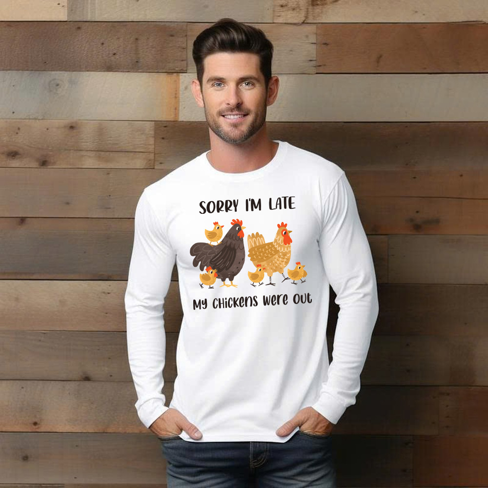 Sorry I’m Late My Chickens Were Out Long Sleeve Shirt Funny Sayings Shirt Gifts For Chicken Farmers.