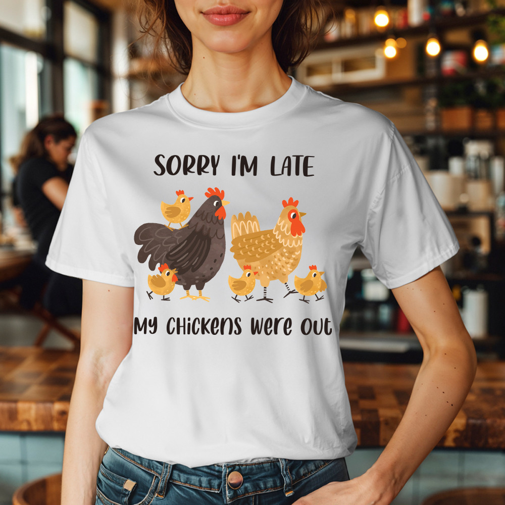 Sorry I’m Late My Chickens Were Out T Shirt Funny Sayings Shirt Gifts For Chicken Farmers.