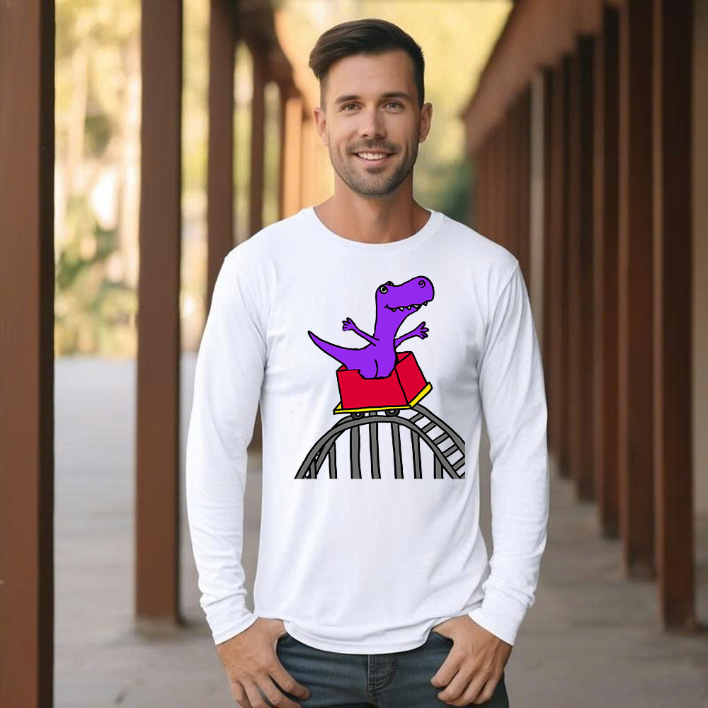 T-Rex Riding Roller Coaster Long Sleeve Shirt Funny Cute Graphic Tee Shirt Apparel Gifts For Him.