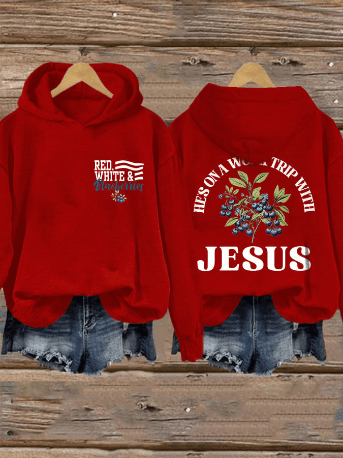 Retro Red White & Blueberries He’s On A Work Trip With Jesus Print Hoodie.