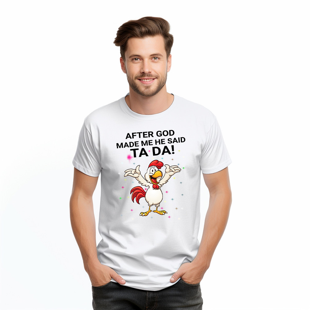 After God Made He Said Ta Da Shirt Funny Chicken Christian T-Shirt Gifts For Christian Day. T-Shirts printed in the USA Exclusive products made by: Rivonaprint. Material: 5.3-ounce, 100% cotton. Seamless double-needle 7/8. Taped neck and shoulders; Tearaway label. Decoration type: Digital Print. All products are made to order and proudly printed to the best…