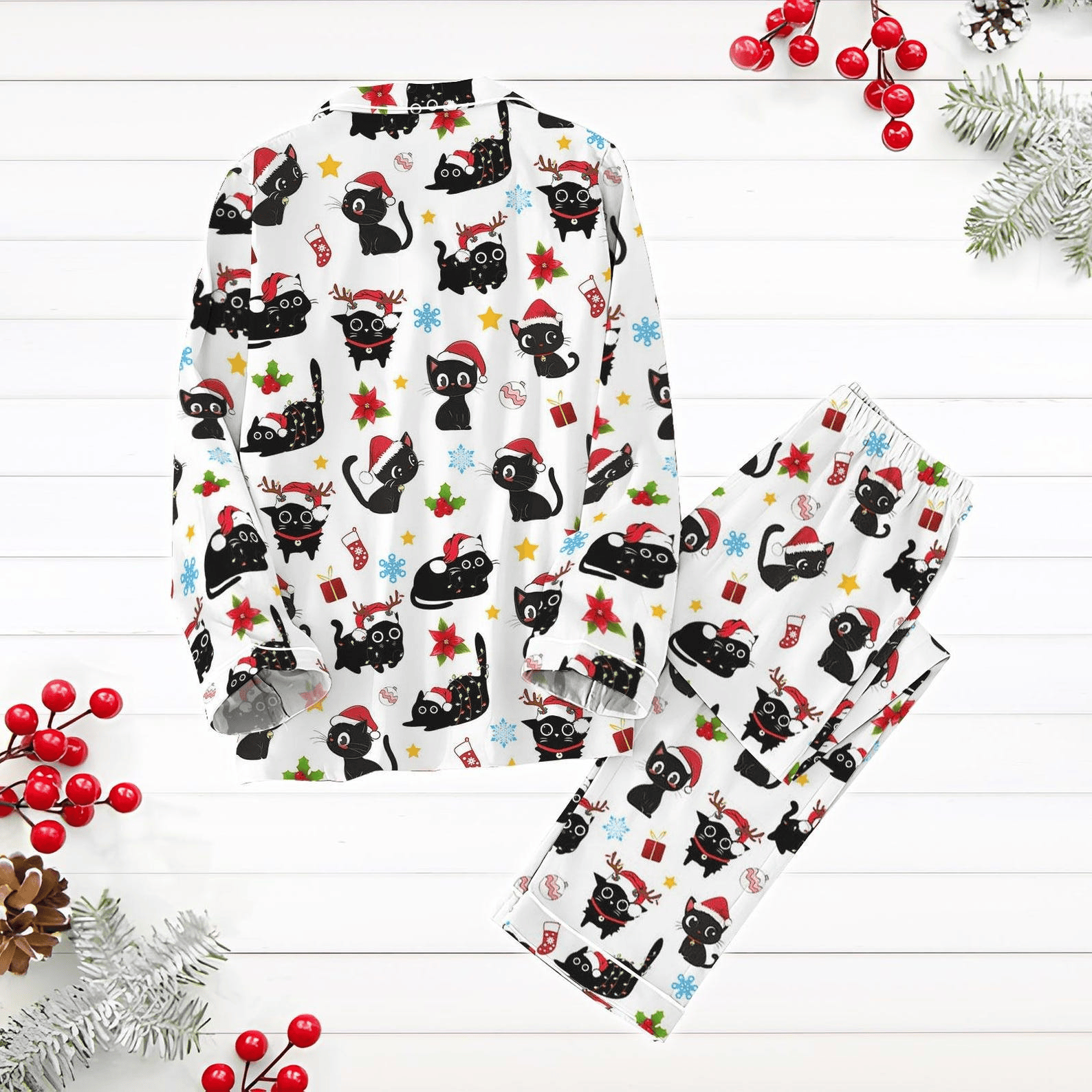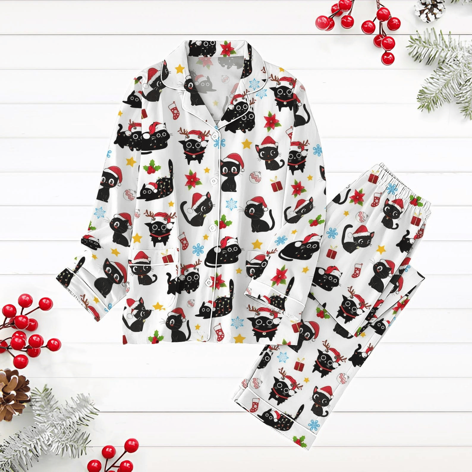 Christmas Black Cat Pajamas Set Kitten Holiday Pajamas Santa Hat Cat Xmas Lights Pjs