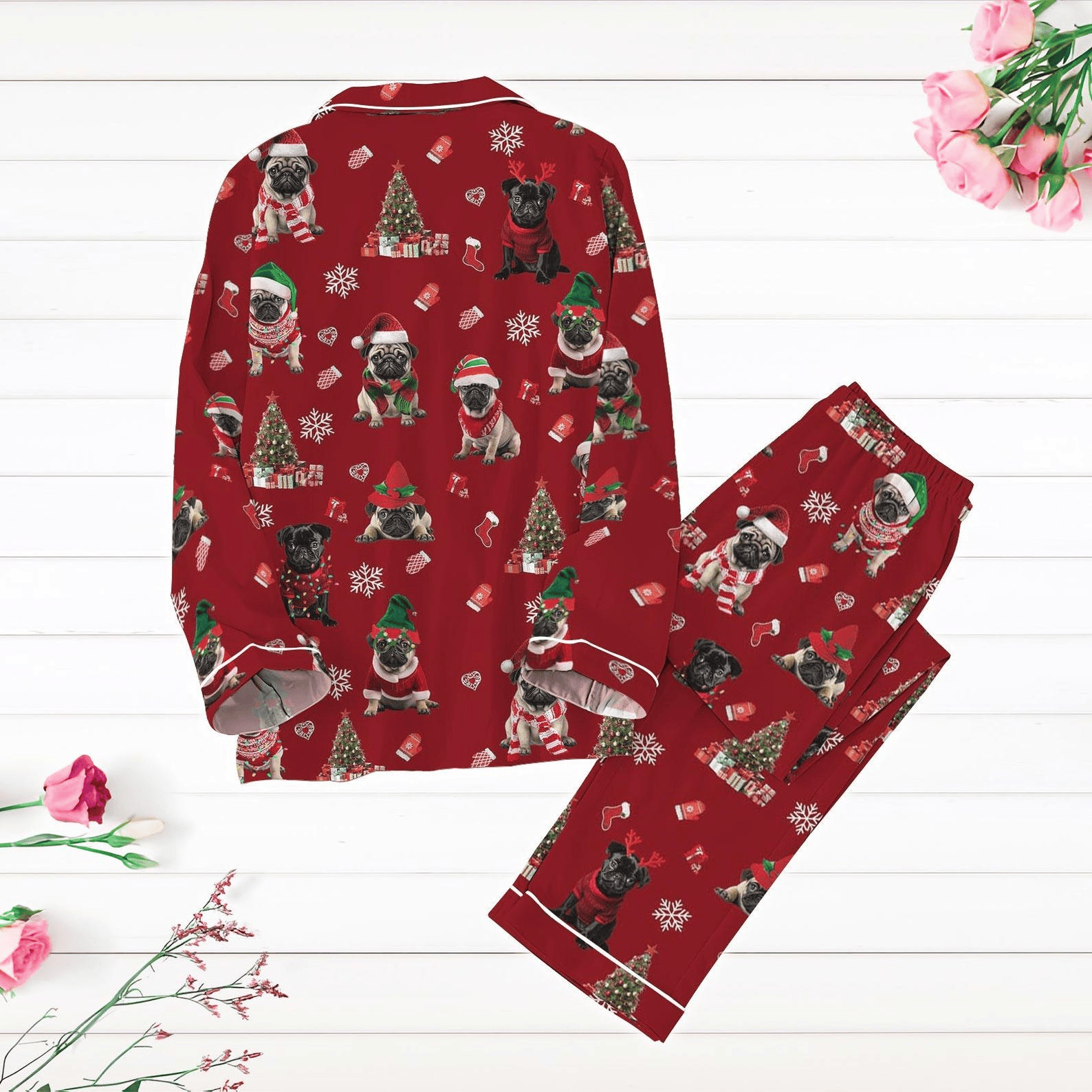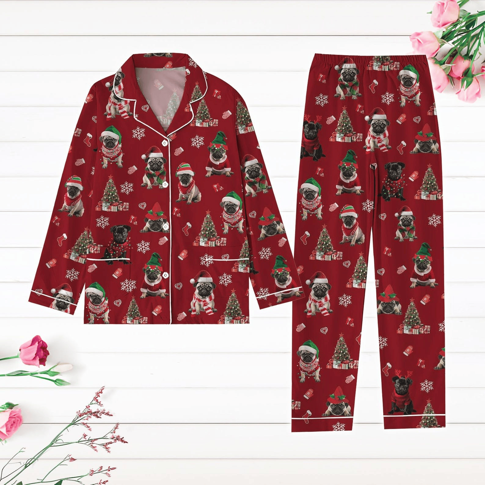 Christmas Pugs Pajamas Set Santa Dog Xmas Pet Lover Christmas Tree Long Sleeve Pyjamas.