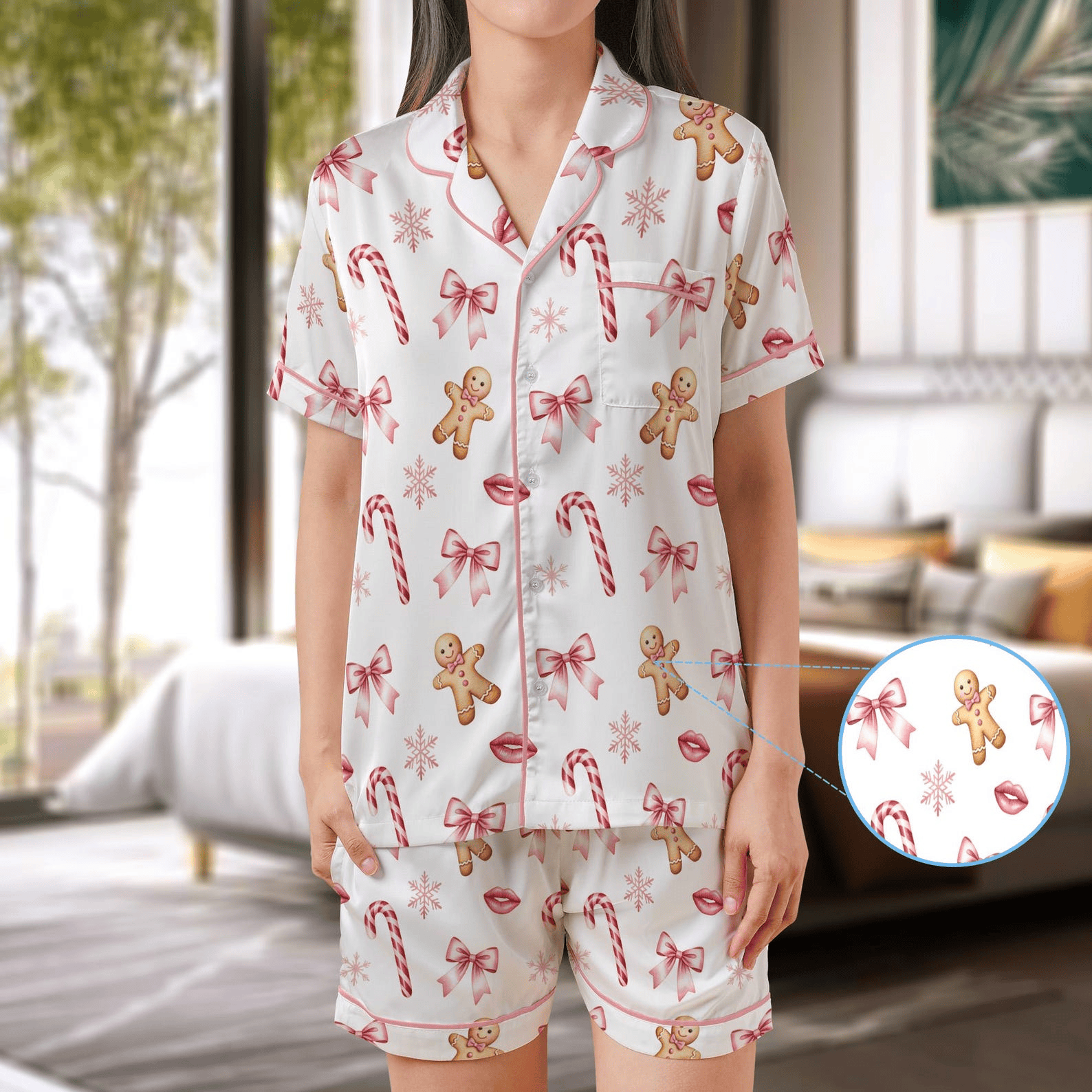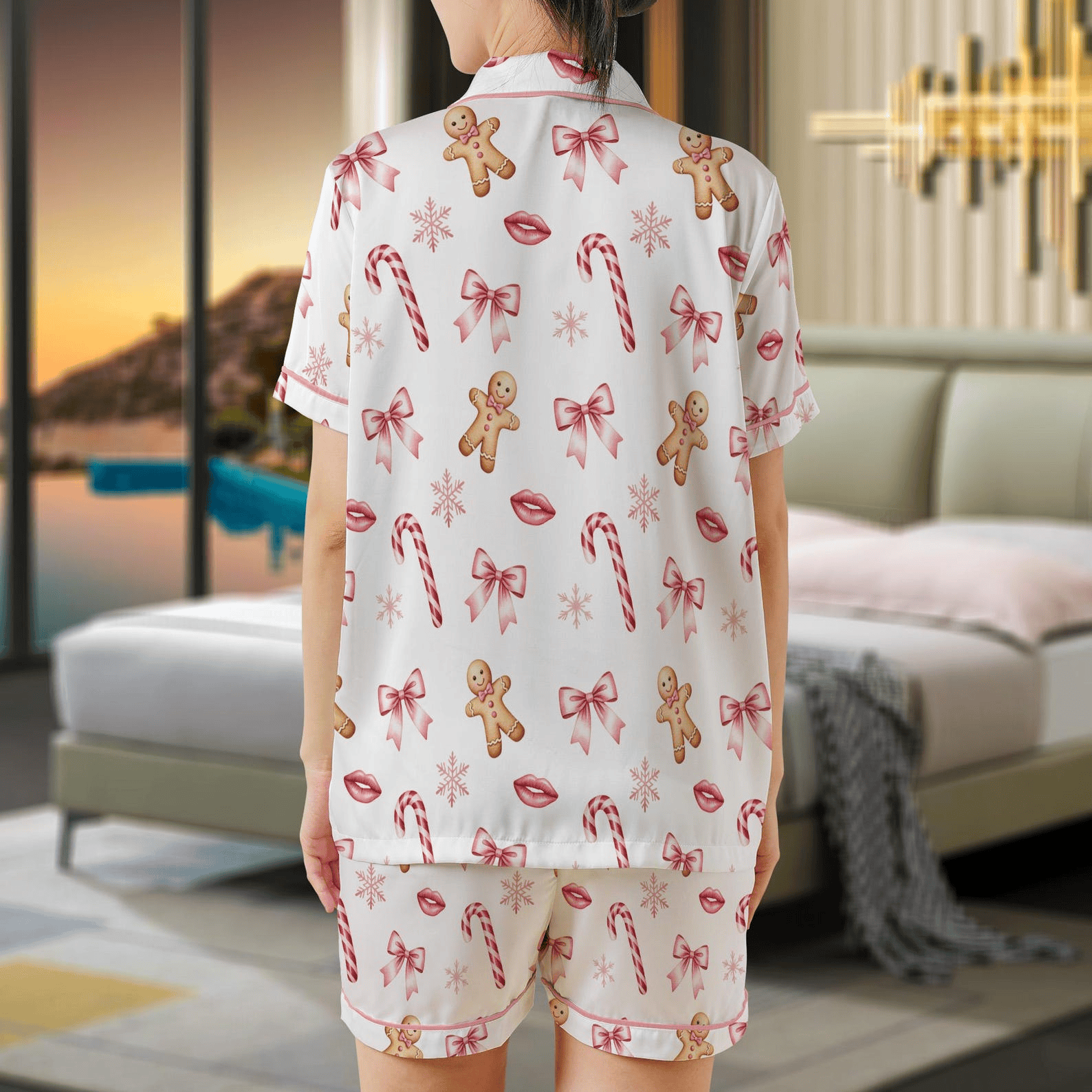 Coquette Christmas Pajama Set Bows & Gingerbread Print Satin Sleepwear.