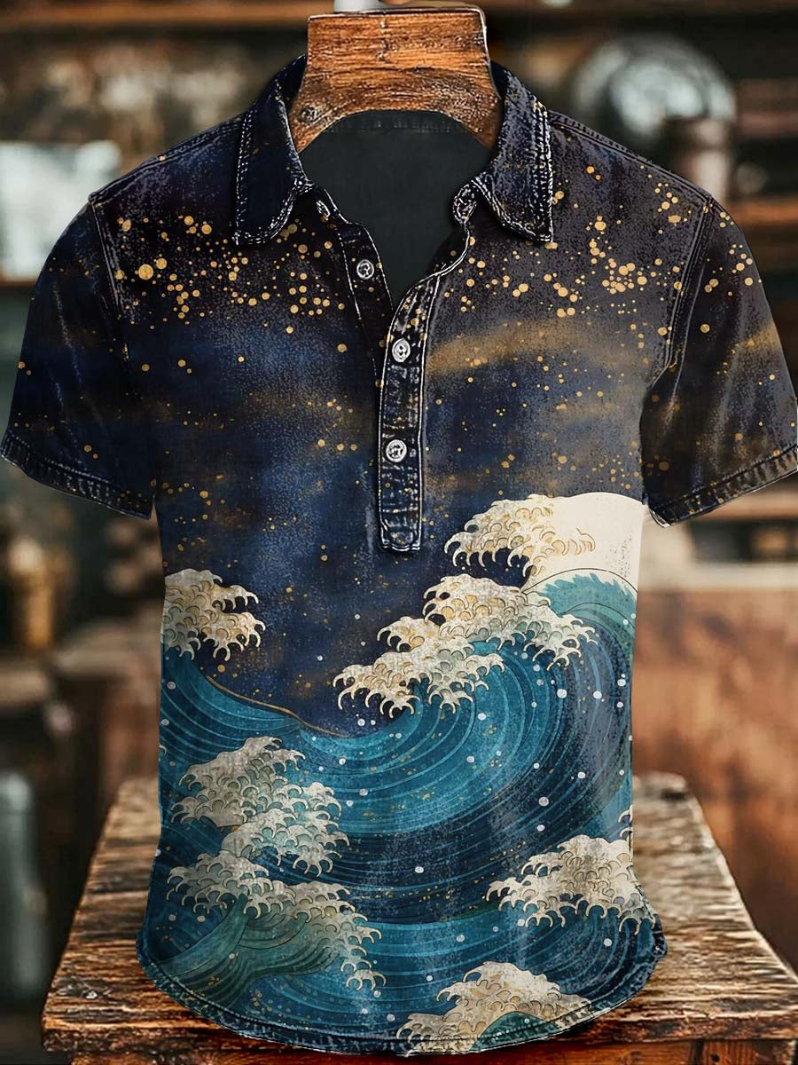 Japanese Abstract Wave Print Casual Short Sleeve Polo Shirt Spooky Gifts For Brother