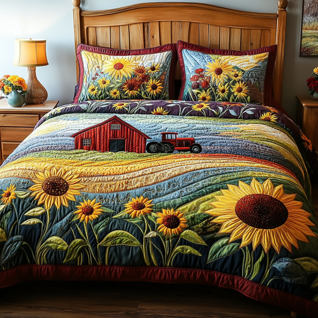 Sunflare Bloom Quilted Bedding Set Bed Decor Sunflower Gift Items.