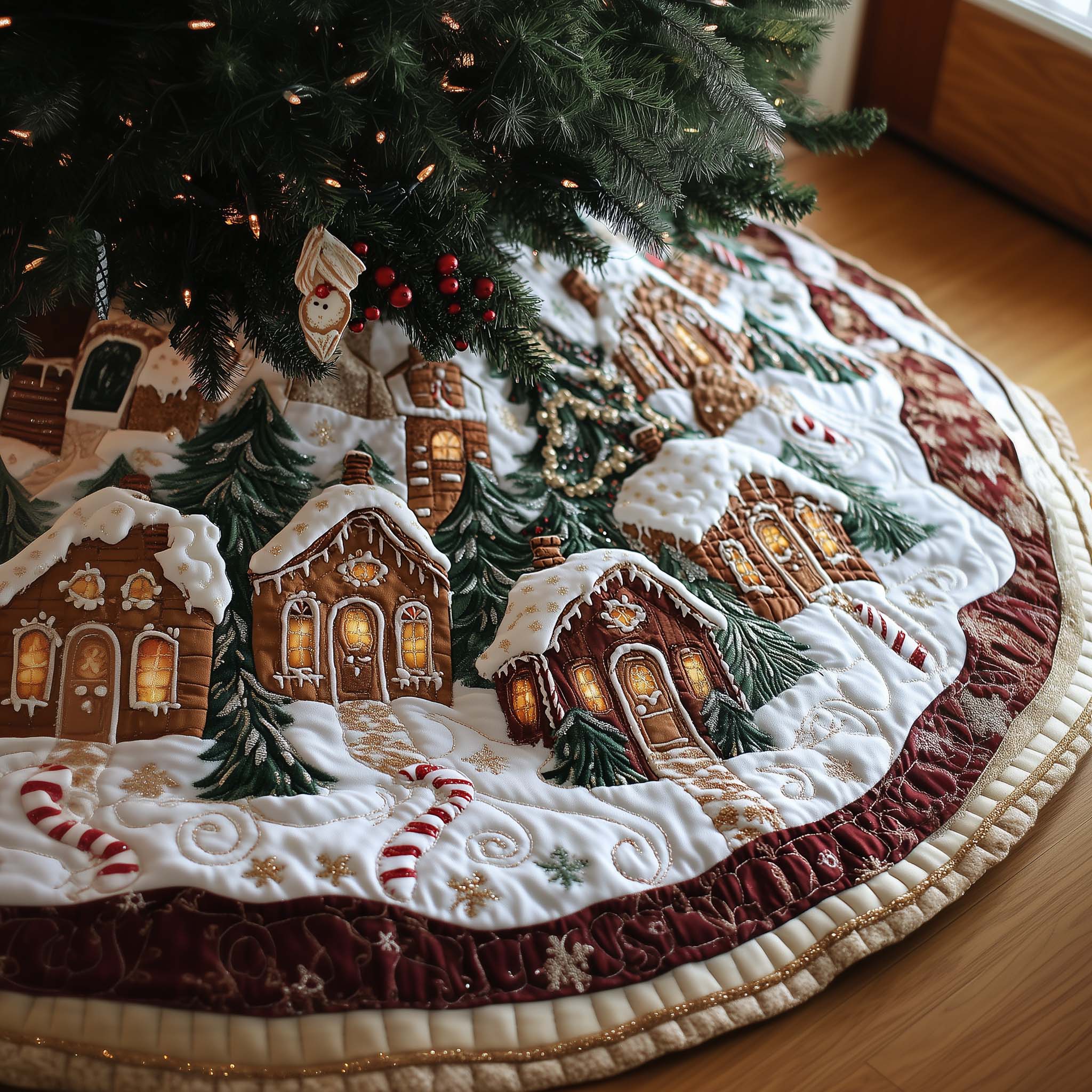 - The tree skirt adds a festive charm to Christmas mornings, creating a beautiful backdrop for the gifts beneath the tree. It elegantly conceals the tree stand and tangled light cords, making it perfect for family holiday decor, Christmas displays, and as a thoughtful gift.