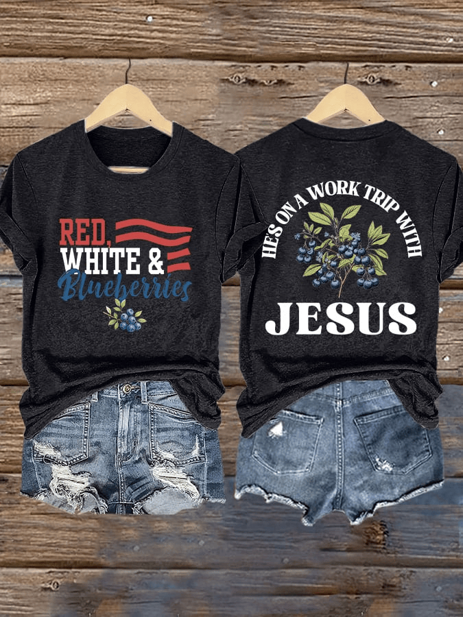Charlie Kirk Retro Red White & Blueberries He’s On A Work Trip With Jesus Print T-Shirt.