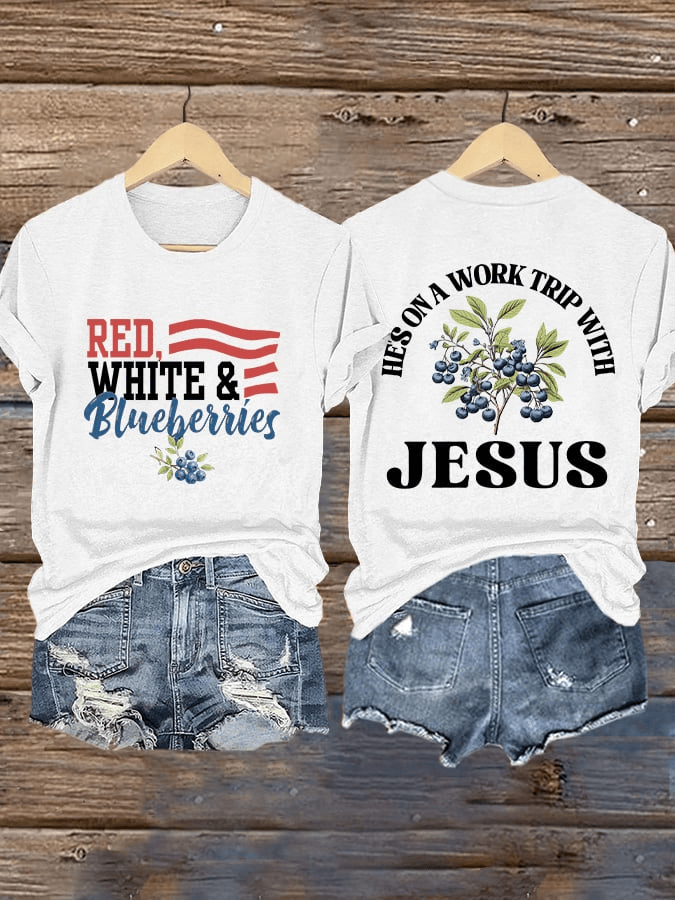 Charlie Kirk Retro Red White & Blueberries He’s On A Work Trip With Jesus Print T-Shirt.