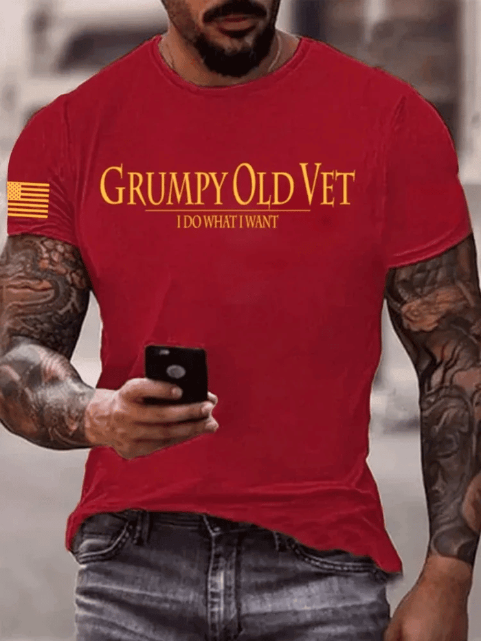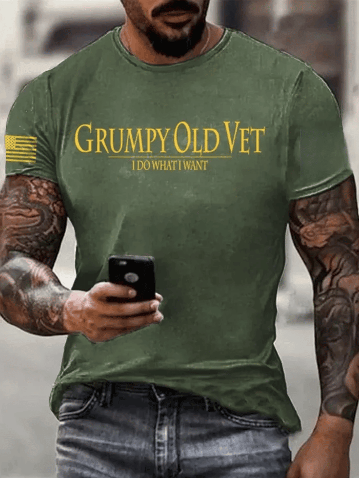 Grumpy Old Vet T-Shirt Men’s Veteran Printed Round Neck T-Shirt Military Appreciation Shirt Gift.