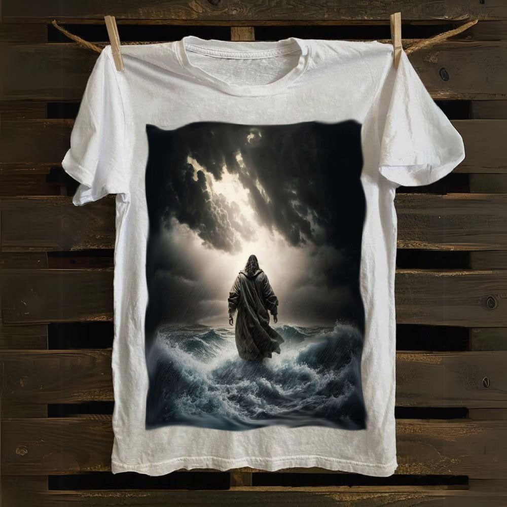 Jesus Walking on Water T-Shirt Faith in the Storm Design Christian Christmas Gift Idea.