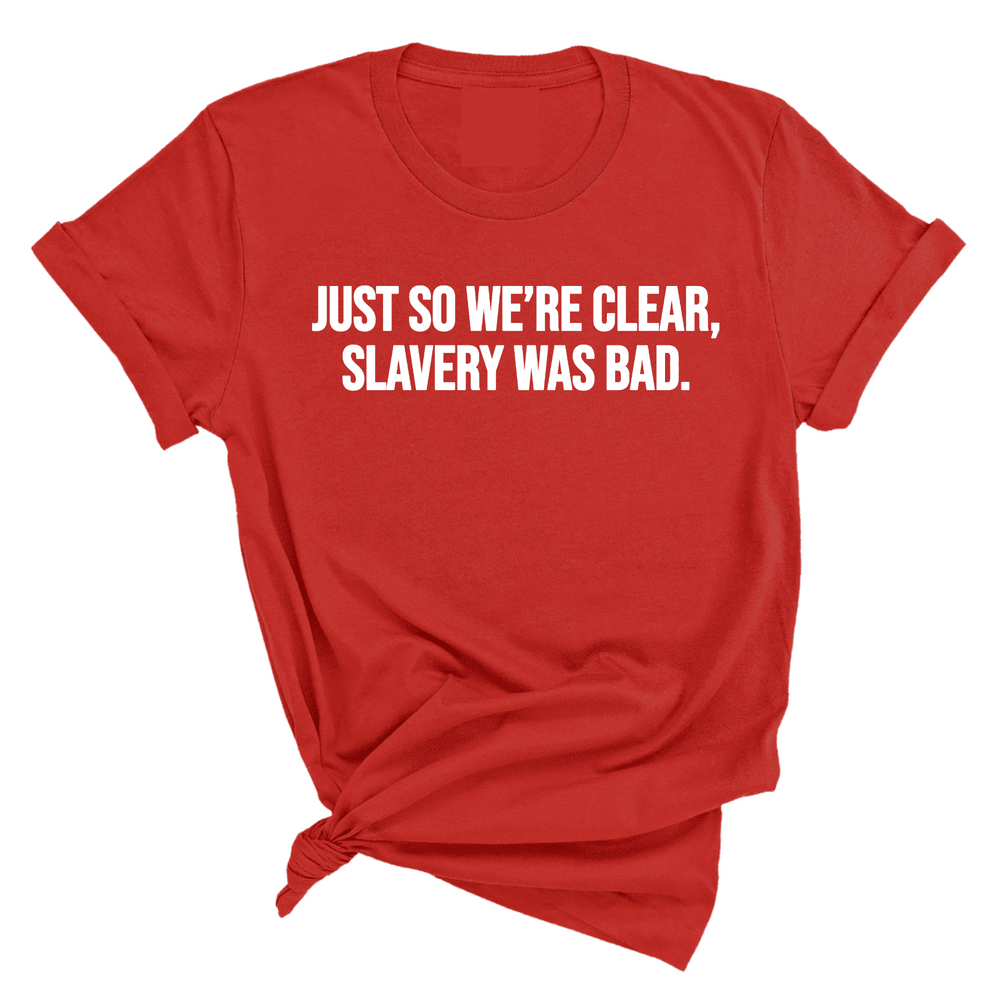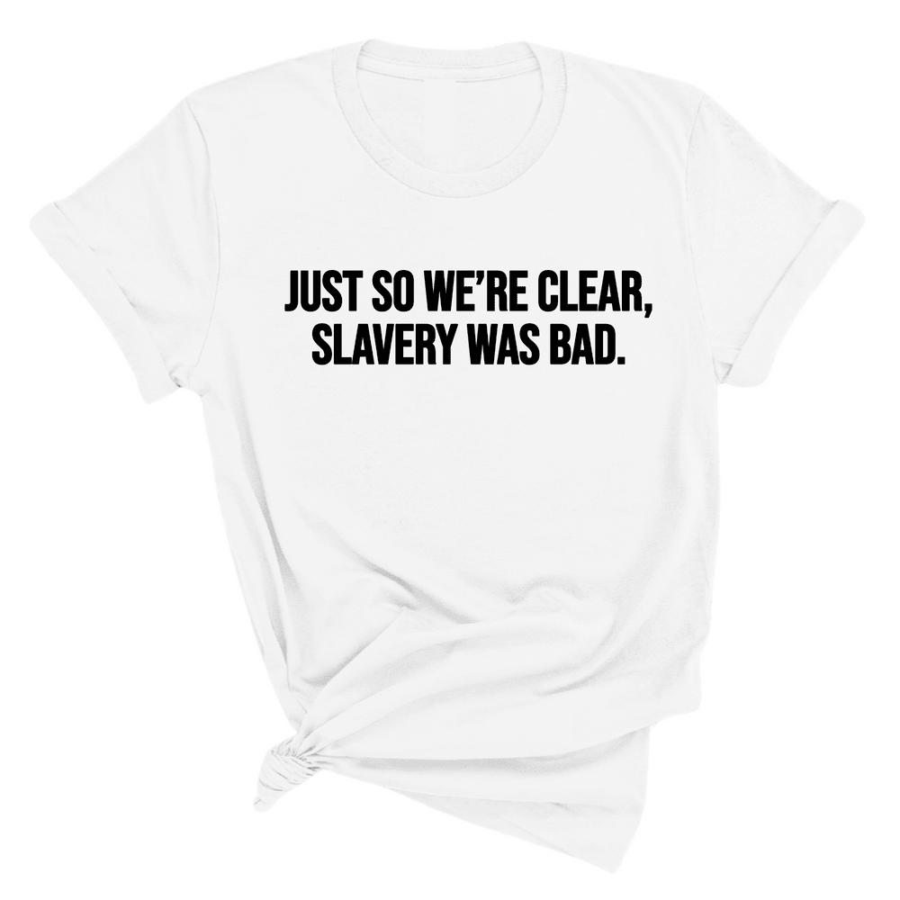 Just So We’re Clear Slavery Was Bad Unisex Tee Political Statement Shirt.