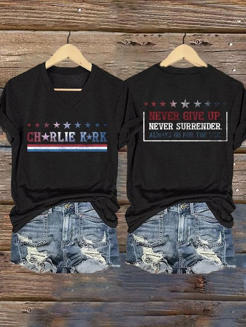 Charlie Kirk Commemorative V-Neck Shirt Never Give Up Never Surrender Charlie Kirk Gifts.