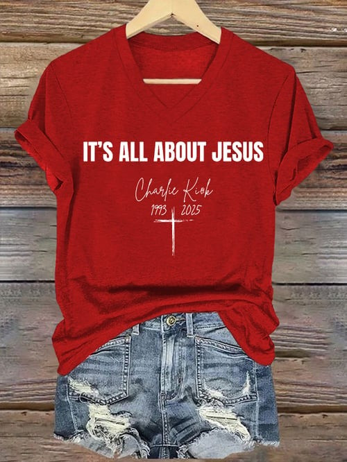 Charlie Kirk It’s All About Jesus V-Neck Shirt 1993 2025 Cross Charlie Kirk Christians Gifts